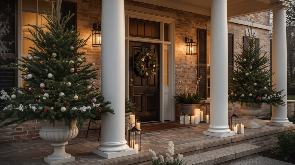 Keep the backdrop simple so your arrangement stands out. White and concrete pots blend effortlessly with snowy steps, warm porch lights, or dark architectural lines. It’s proof that holiday decor doesn’t have to be loud to be beautiful.